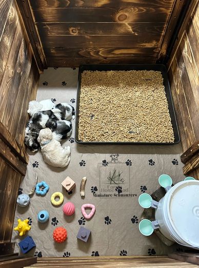 A: *We start potty training lessons at about 4 weeks old when they start weaning from Mama. They are raised in our home so at first, we train them in a “litter box” that is a plastic container that has horse bedding pine wood pellets in it to help them know the smells outside.