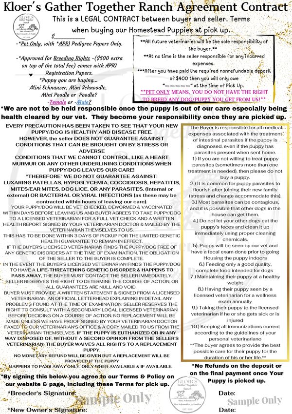 MORE INFORMATION IS PROVIDED ON THE CONTRACT THAT YOU HAVE TO AGREE WITH IN ORDER TO BUY A PUPPY FROM US.